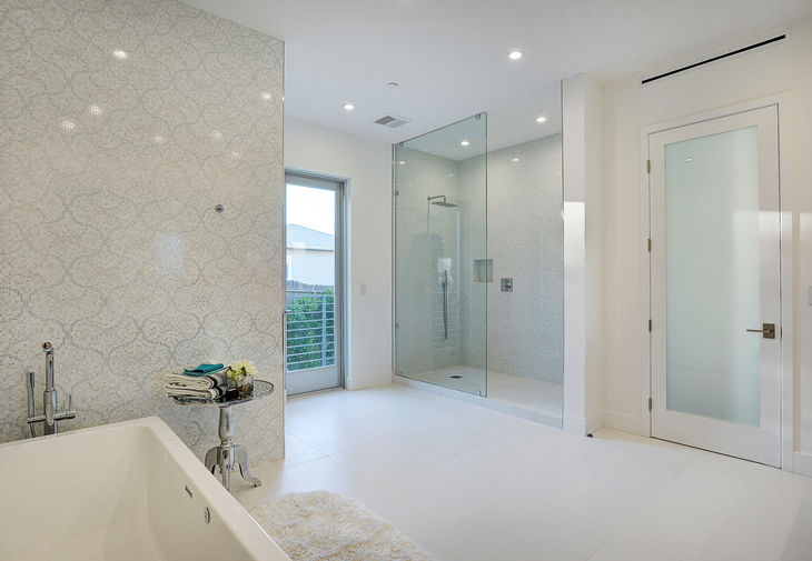 Showcase Kitchen is a study in whites featuring Caesarstone counters, Italian lacquer cabinets, Miele appliances, wine fridge and a center island with six seat breakfast bar that opens to spacious family media room inviting your guests to venture out to a private pool, spa and patios with dining arbor and lounge area with chipped glass fire pit and built-in bench seating. Upper level features three spacious bedrooms, all with view balconies, and a Master suite with walk-in closet and luxe spa bathroom with chrome, glass Porcelanosa mosaic tile, separate large shower and stand alone tub with waterfall shower head. All bathrooms have Caesarstone floors and counters and Hans Grohe fixtures. Renew & refresh in this private oasis. Minutes to fine dining, shopping and entertainment.